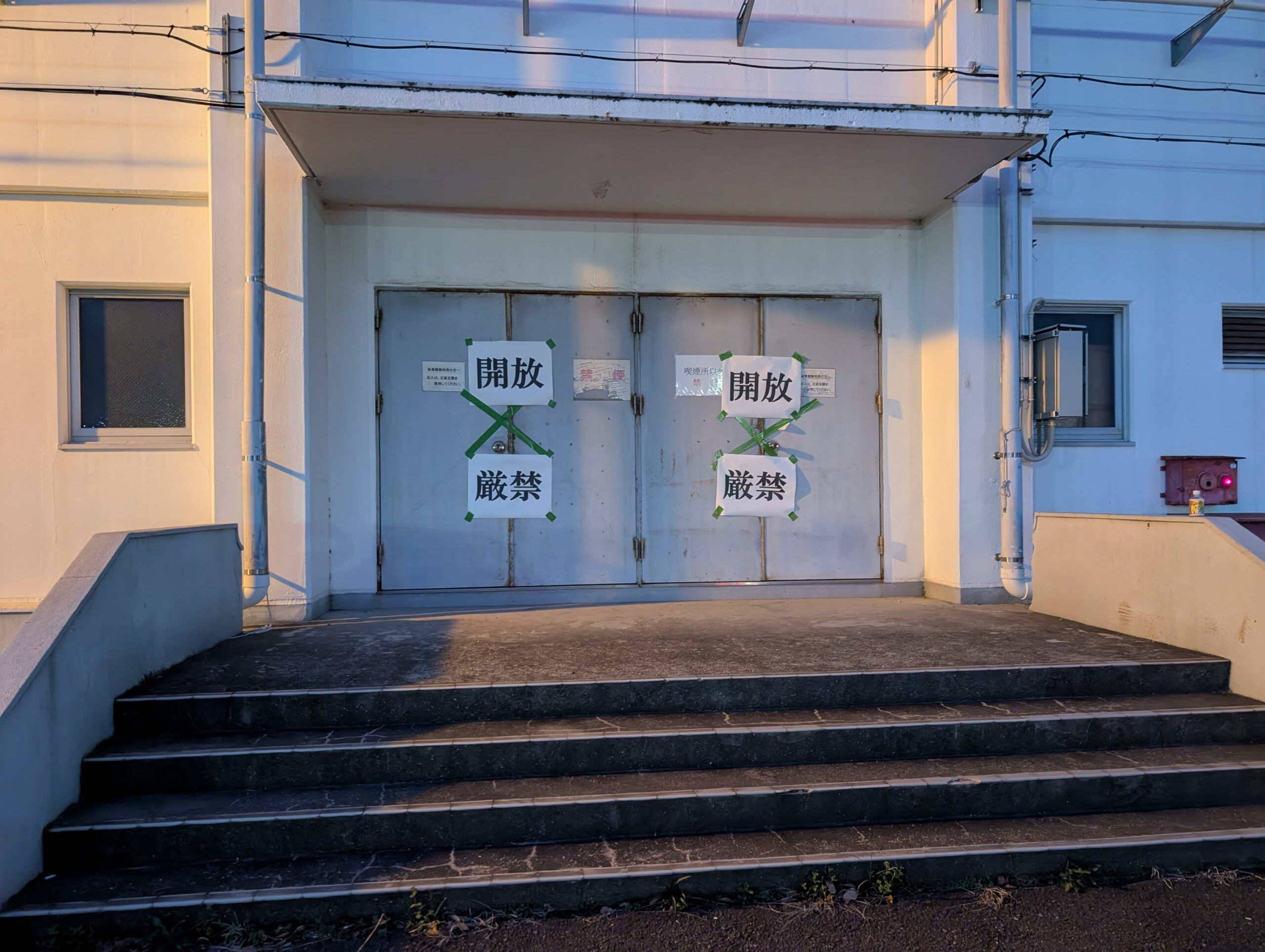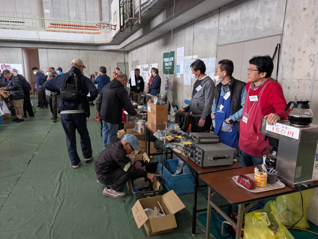 会場の体育館の東側非常口です。いつもここから搬入搬出、発電機からの電源コードをここから通しているのですが、ガッツリ閉鎖されています。ただ、”開放厳禁”ですから、開けっ放しがダメというだけで、例年通りできそうです。西ハムの役員さんに許可得て準備開始! それから慌ただしくて写真撮ってるどころではありませんでした。午後1時過ぎにようやく・・・